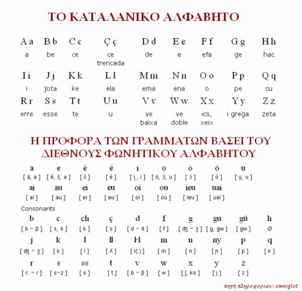 Δείτε στην παρακάτω εικόνα το αλφάβητο τον Καταναλών και την προφορά του κάθε γράμματος. Μετά από την εικόνα θα πούμε για τις ηχητικές ιδιαιτερότητες του κάθε γράμματος και θα δούμε και δύο βίντεο, για να τα καταλάβουμε καλύτερα.